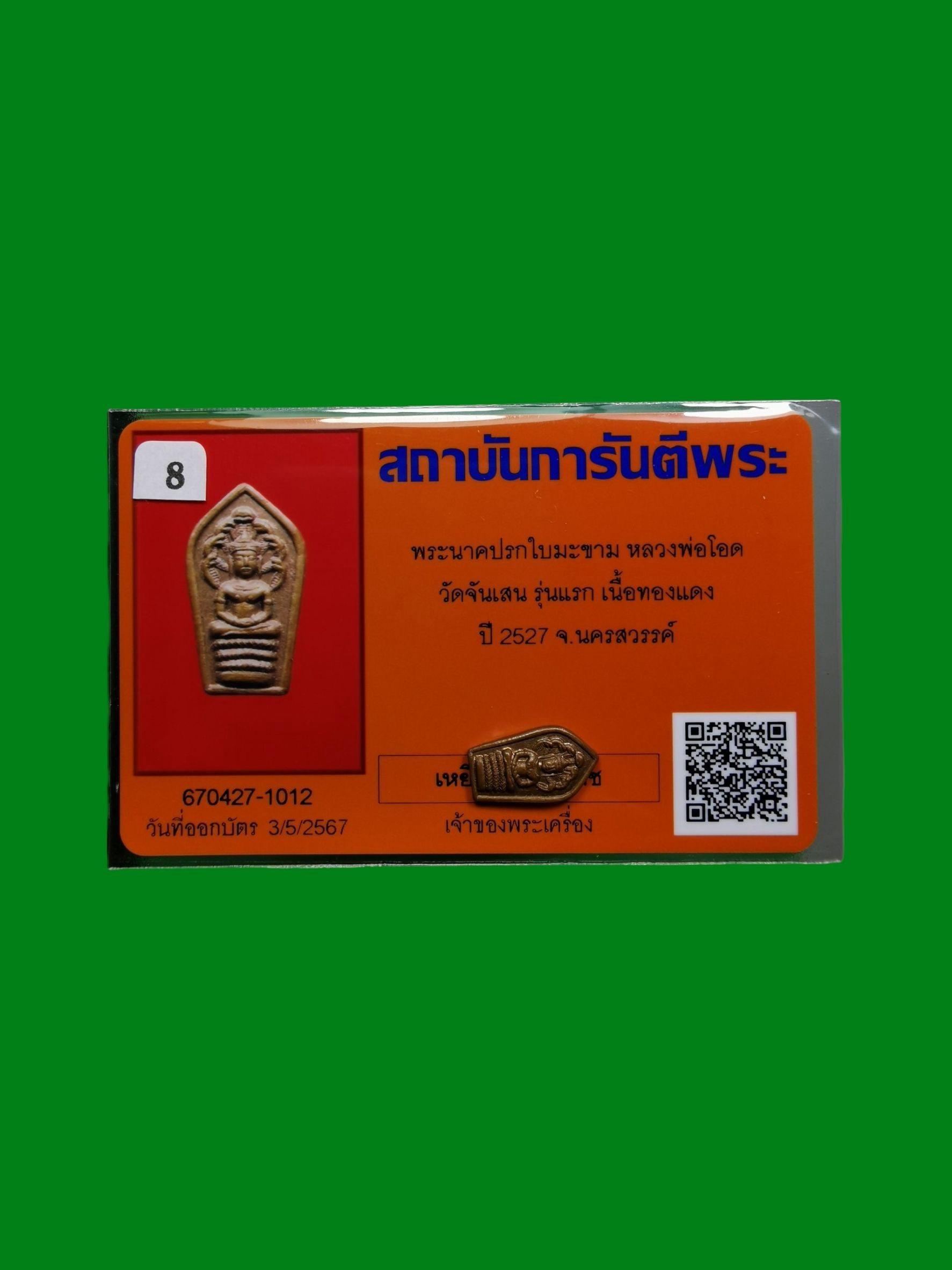Phra Naga Prok, Lp Ood, Wat Chan Sen, first edition, copper material,B.E.2527, Nakhon Sawan Province, with certificate.